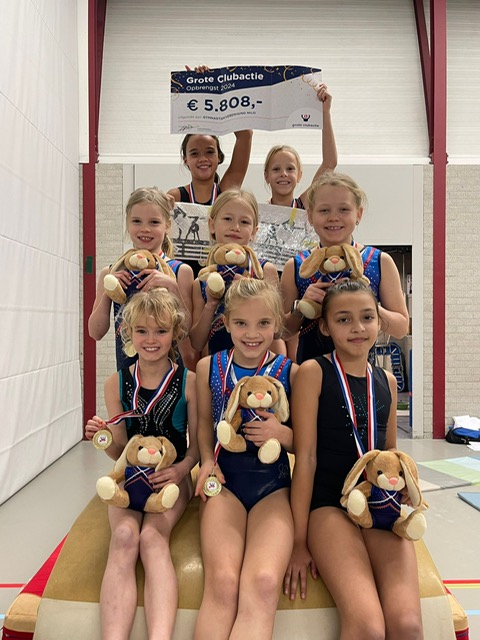 Ook dit jaar deed gymvereniging Nilo weer mee aan de Grote Club Actie. Omdat het vorig jaar al een groot succes was, hadden we ons doel best hoog ingezet. Door het enthousiasme van alle turntoppers werd het doel ruimschoots gehaald en ontvingen we een cheque van maar liefst € 5808! Er kregen 45 kinderen een medaille omgehangen dit jaar, wat betekent dat je 25 of meer loten hebt verkocht, ook dat was een nieuw record. Bij de medaille uitreiking was er voor de top 10 verkopers nog een kleinigheidje, de Nilo mascotte in het eigen clubpakje en voor degene die deze vorig jaar al hadden gekregen een mooie medaille houder. We willen iedereen bedanken die de onze vereniging heeft gesteund, we kopen daar weer extra materialen voor en gaan op 1 maart het succes vieren met onze turntoppertjes!